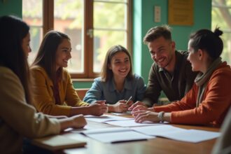 Adolescents collaborant sur un devoir dans une classe moderne