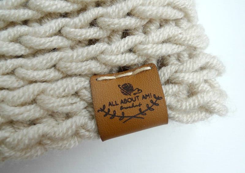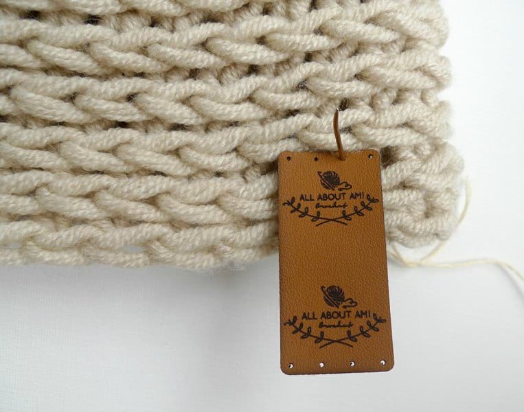 Un projet de crochet achevé, un tricot posé sur la table : voilà l’occasion idéale d’ajouter la signature qui change tout, les fameuses étiquettes de vêtement. Même avant de vendre mes créations, j’avais envie de marquer le coup avec une touche personnalisée, histoire de distinguer mes pièces ou celles que j’offrais à mes proches. Très vite, Diane de Brickbubble m’a été chaudement recommandée. Elle propose un éventail de matériaux : ultraleather, ultrasuède, bois, liège… De quoi s’adapter à tous les styles et toutes les envies. Vous êtes nombreux à m’avoir demandé comment je m’y prends pour coudre ces étiquettes pliantes ; j’ai donc pris le temps de filmer chaque étape et de capturer le moindre détail en photo. Il existe plusieurs façons de fixer ces étiquettes, mais voici ma méthode favorite, celle qui ne m’a jamais déçue.