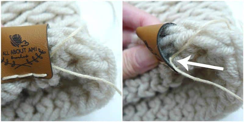 Je vais montrer comment fixer mon étiquette ultraleather cannelle sur mon Cache Triple Luxe (modèle en accès libre ICI). L’objectif : traverser tous les trous de l’étiquette et faire ressortir les extrémités du fil à broder côté intérieur, pour nouer et dissimuler le surplus à l’intérieur. Prêt pour la démonstration ?