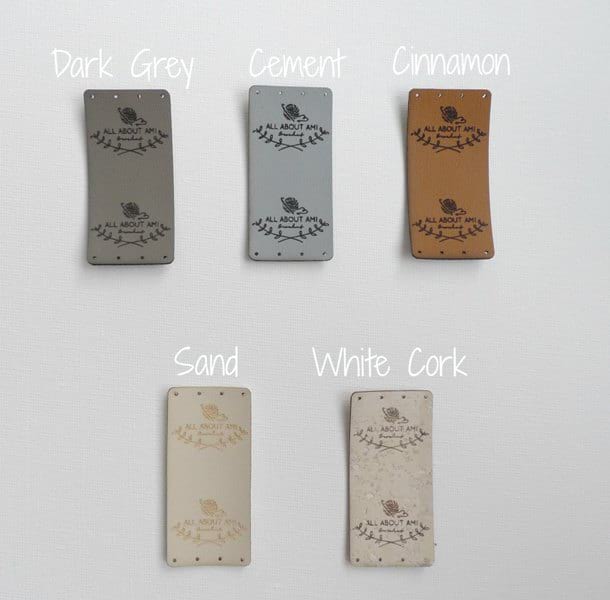 Parlons des couleurs et matières proposées par Brickbubble : gris foncé, ciment, cannelle, sable, liège blanc. Le simili cuir apporte une allure soignée, et il passe sans problème à la machine puisque c’est du cuir synthétique. Vous transmettez votre logo à Diane, vous choisissez la taille (la photo montre un format 1″ x 2.125″), le nombre d’étiquettes désiré, la couleur… et Diane s’occupe du reste.