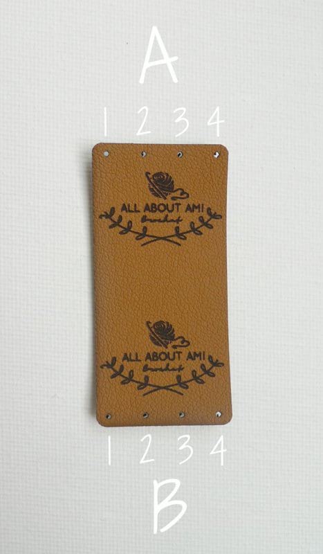 Regardez de près mon étiquette ultraleather cannelle : c’est celle que je sélectionne le plus souvent, elle va avec tout. Le logo apparaît en haut et en bas, dans la bonne orientation, grâce à l’option « Dossier droit ». Si vous fixez l’étiquette sur le rebord d’un bonnet, peu importe que le revers soit tourné, le logo reste lisible. D’autres options existent pour orienter le texte différemment (« Foldover retourné », « Foldover latéralement »), selon l’effet recherché. On retrouve quatre trous pré-perforés en haut et en bas, pile à la bonne taille pour du fil à broder. Pour la suite, on appellera la partie supérieure de l’étiquette « A » (trous 1, 2, 3 et 4) et la partie inférieure « B » (trous 1, 2, 3 et 4).