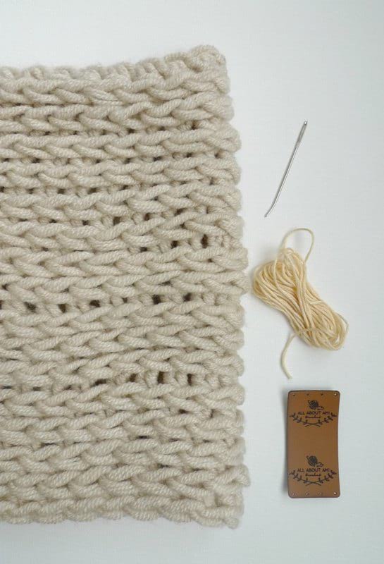 Dès que mon tricot ou mon ouvrage au crochet est terminé, la prochaine étape consiste à apposer une étiquette de vêtement. Pour cela, il vous faut une étiquette pliante, du fil à broder et une aiguille. J’utilise personnellement des aiguilles à pointe courbée ICI ; leur forme facilite vraiment la prise en main au moment de percer la matière. Une bonne paire de ciseaux sera aussi utile, celles qui apparaissent dans mes vidéos viennent de Warm Crochet ICI (et avec le code ALLABO, vous bénéficiez de 10% de réduction). Le bonnet présenté dans ce tutoriel est mon modèle gratuit Bonnet de Bébé Basique !