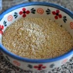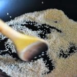 Prenez une poêle, versez-y les graines de sésame et faites-les dorer en remuant constamment à la cuillère en bois. Dès que la couleur vire à l’or, stoppez tout.