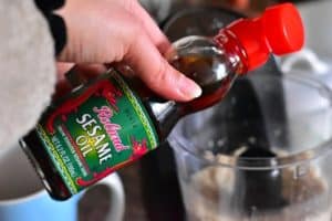 - Ajoutez l’huile de sésame, une cuillère à soupe à la fois, en veillant à ne pas rendre la préparation trop liquide. Ajustez la quantité d’huile selon la consistance désirée.