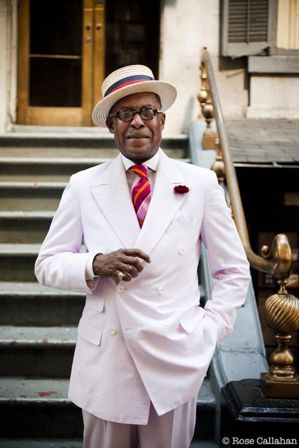 Dr André Chruchwell, seersucker rose à double boutonnage et chapeau canotier, Dandy Portraits