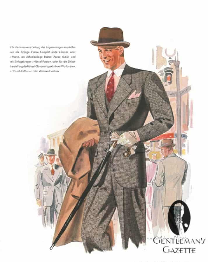 Un exemple d’élégance automnale : costume gris à revers crantés, chemise Winchester rose, pochette rose et gants beiges.