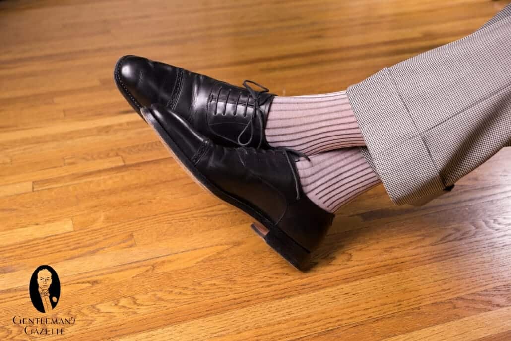 Sans tomber dans l’excentricité, des chaussettes à rayures roses et grises signées Fort Belvedere injectent de la personnalité dans une tenue tout en restant sobres, idéales avec un costume gris, clair ou foncé.