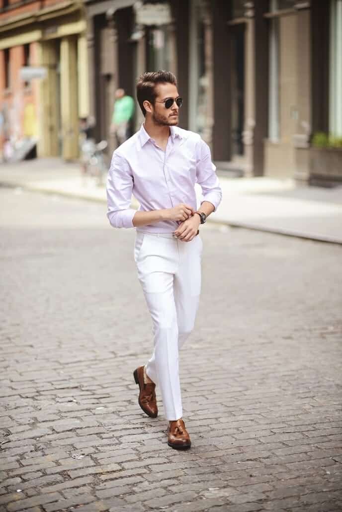 En été, le tandem rose et blanc reste imbattable : le blanc illumine, le rose apporte la touche de douceur. Une chemise rose et un pantalon blanc forment une tenue estivale aussi simple qu’efficace.