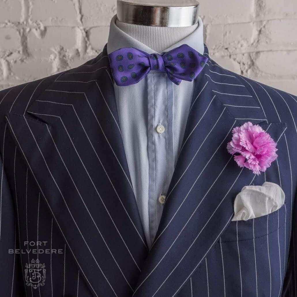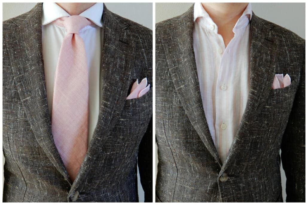 Par expérience, le rose et le marron forment une alliance solide, notamment en été, une veste en lin marron avec une cravate rose, par exemple. Le rose et le bleu aussi, mais attention aux nuances : porté avec un bleu moyen, le rose peut faire virer le bleu vers le violet. Ce n’est pas un défaut, mais mieux vaut en avoir conscience pour éviter les surprises.